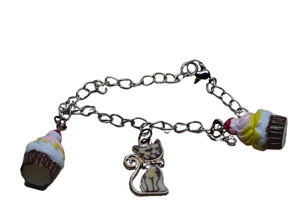 Το βραχιόλι με γάτα και πανκέικ από πολυμερή πηλό είναι μια ξεχωριστή δημιουργία που συνδυάζει την τέχνη με την παιχνιδιάρικη διάθεση. Η μεταλλική αλυσίδα του στολίζεται με τρία γοητευτικά στοιχεία: μια κομψή γάτα και δύο πολύχρωμα πανκέικ, χειροποίητα από πολυμερή πηλό.