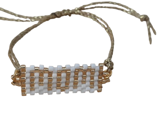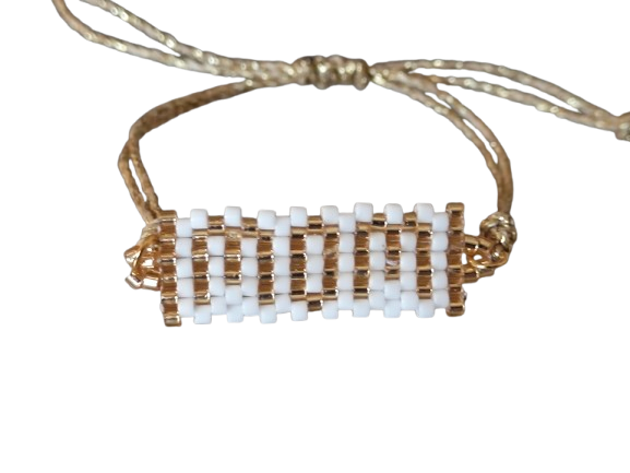 Οι λευκές και χρυσές χάντρες Miyuki συνδυάζονται αρμονικά και προσφέρουν φωτεινό αποτέλεσμα. Παράλληλα, το σχέδιο παραμένει διαχρονικό, ώστε να ταιριάζει με κάθε στυλ. Το βραχιόλι φοριέται εύκολα μόνο του, αλλά συνδυάζεται όμορφα και με άλλα κοσμήματα.