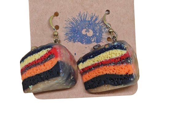 Δώσε χρώμα, γλυκύτητα και fun στο στυλ σου με τα σκουλαρίκια Παστάκι Τούρτας από πολυμερή πηλό. Το σχέδιο θυμίζει ρεαλιστική φέτα πολύχρωμης τούρτας, δημιουργώντας ένα αξεσουάρ που τραβάει τα βλέμματα.