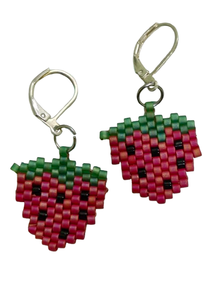 Χειροποίητα σκουλαρίκια φράουλα από χάντρες Miyuki Delica 10/0, φτιαγμένα με την τεχνική peyote. Ο συνδυασμός κόκκινων, πράσινων και μαύρων χαντρών δημιουργεί ένα ζωντανό, παιχνιδιάρικο σχέδιο που αποπνέει καλοκαιρινή διάθεση.