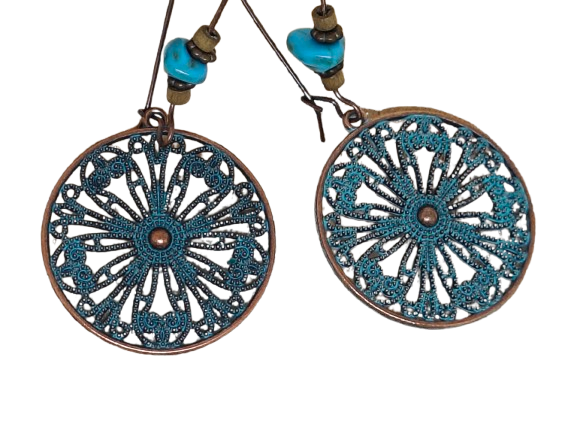 Αναδείξτε το bohemian στυλ σας με αυτά τα ξεχωριστά σκουλαρίκια. Ο σχεδιασμός τους θυμίζει χειροποίητο κέντημα και αποπνέει γεωμετρική αρμονία. Η μπλε-οξειδωμένη πατίνα τονίζει το περίτεχνο κυκλικό μοτίβο, ενώ η τιρκουάζ πέτρα προσθέτει ζωντάνια και έθνικ αισθητική.