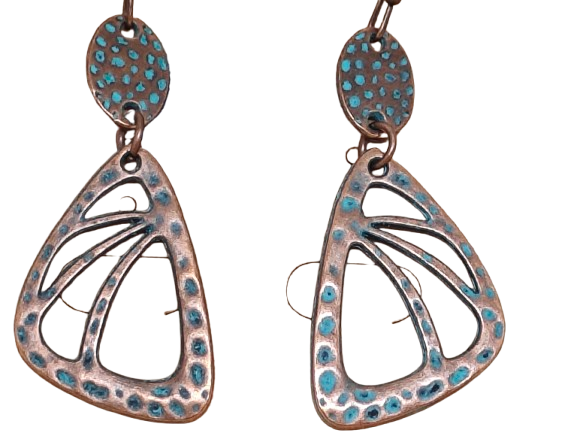 Ανακάλυψε τα μοναδικά χειροποίητα σκουλαρίκια σε τριγωνικό σχήμα με καλλιτεχνική boho αισθητική. Κατασκευασμένα από οξειδωμένο χαλκό, αυτά τα σκουλαρίκια συνδυάζουν έντονη γεωμετρία με φυσική rustic υφή. Οι τιρκουάζ λεπτομέρειες τονίζουν το περίγραμμα και προσθέτουν έθνικ χαρακτήρα.