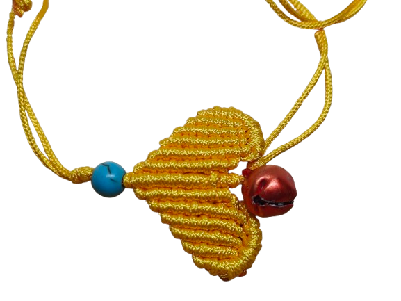 Φώτισε το στυλ σου με αυτό το χειροποίητο βραχιόλι μακραμέ σε έντονο κίτρινο χρώμα και σχέδιο καρδιάς. Το γαλάζιο χαολίτη στο κέντρο ηρεμεί το πνεύμα, μειώνει το άγχος και ενισχύει τη θετική διάθεση. Το μικρό κόκκινο καμπανάκι προσθέτει χαρούμενο ήχο και παιχνιδιάρικη κίνηση σε κάθε σου βήμα.