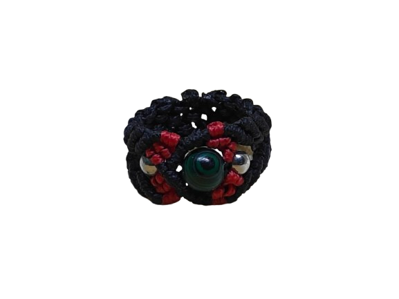 Το χειροποίητο δαχτυλίδι μακραμέ κλέβει την παράσταση με διαγώνιο, πολύχρωμο μοτίβο.