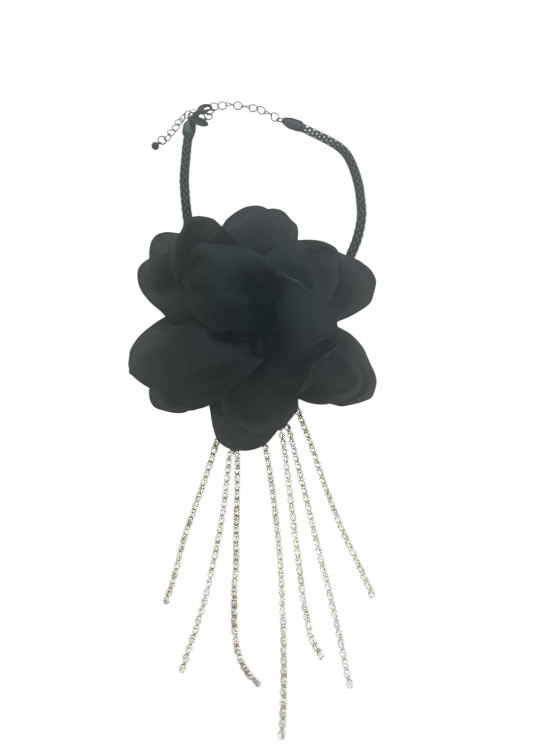 Choker με μαύρο λουλούδι και strass αλυσίδες. Κομψό, ρομαντικό και εντυπωσιακό για κάθε περίσταση.