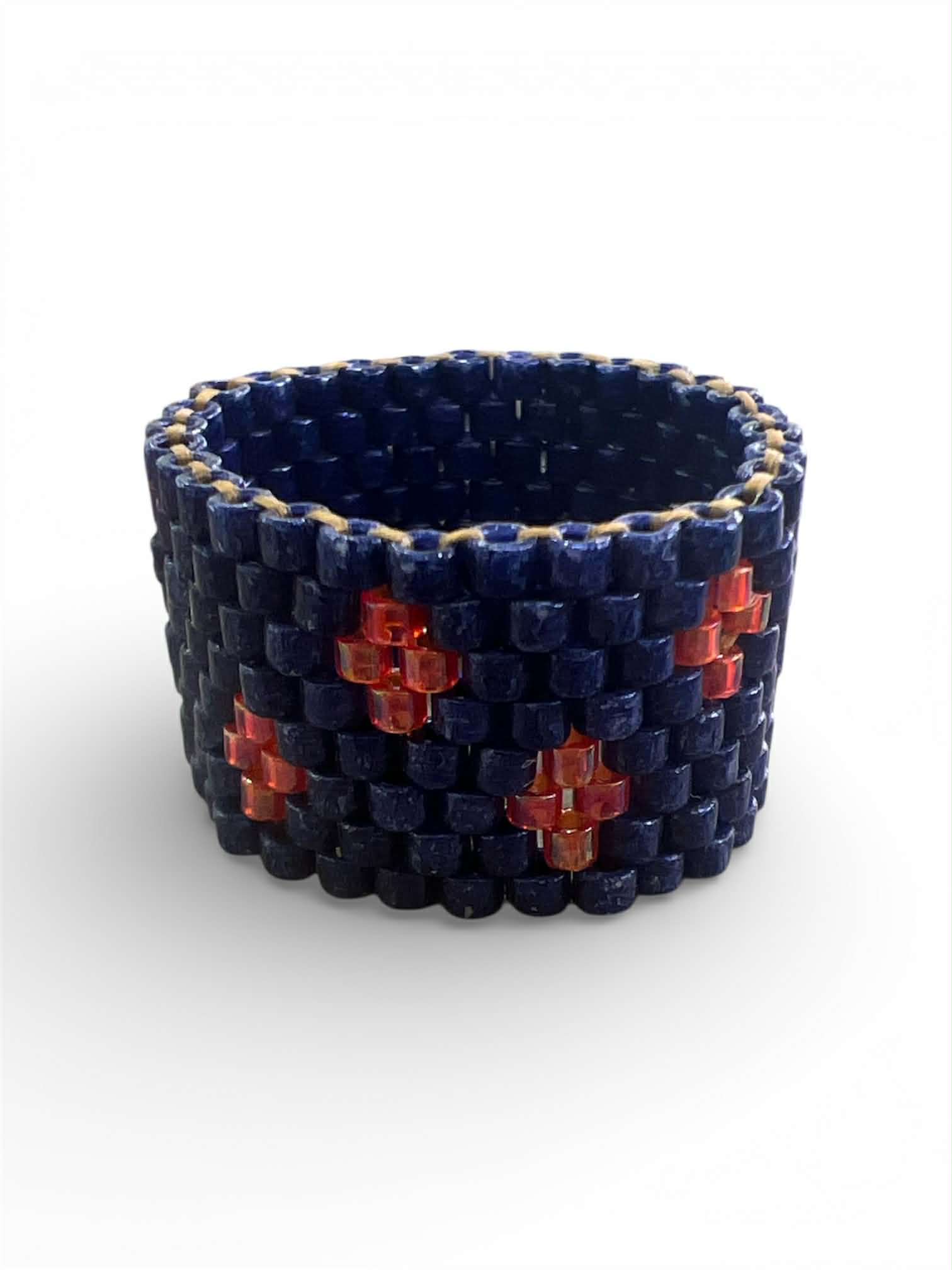 Το γεωμετρικό κόκκινο μοτίβο από ιριδίζουσες διάφανες χάντρες δημιουργεί μια όμορφη αντίθεση πάνω στο βαθύ μπλε. Το δαχτυλίδι αναδεικνύει το χέρι χωρίς υπερβολή και ταιριάζει σε minimal, μοντέρνα και πιο artistic εμφανίσεις.